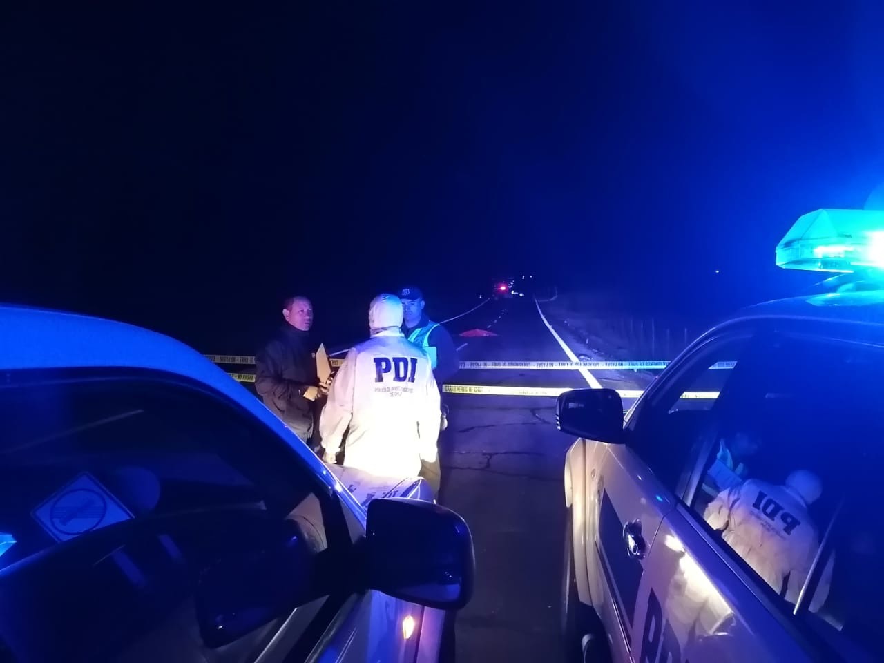 Detectives de la Brigada de Homicidios de la PDI, junto a peritos del Lacrim y SIAT de Carabineros, concurrieron, por instrucción del fiscal de turno Carlos Eltit, al Km 19 de la Ruta 11-CH, por un accidente que terminó con la vida de un hombre de 66 años, quien se encontraba tendido en la ruta.