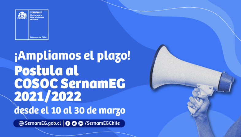 Hasta el 30 de marzo estarán abiertas las postulaciones para que las organizaciones de base de la región participen del Consejo Nacional de la Sociedad Civil (COSOC) del Servicio Nacional de la Mujer y la Equidad de Género (SernamEG), un mecanismo de participación ciudadana, de carácter consultivo y democrático, que tiene como objetivo profundizar y fortalecer la relación entre la sociedad civil organizada y el servicio público.