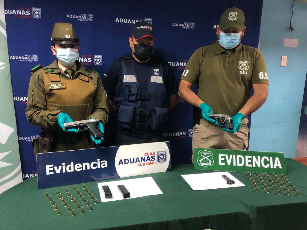 Labor de fiscalización conjunta de Carabineros del O.S.7 y Aduanas detectó a pasajeros de un bus con las armas ocultas en sus vestimentas.