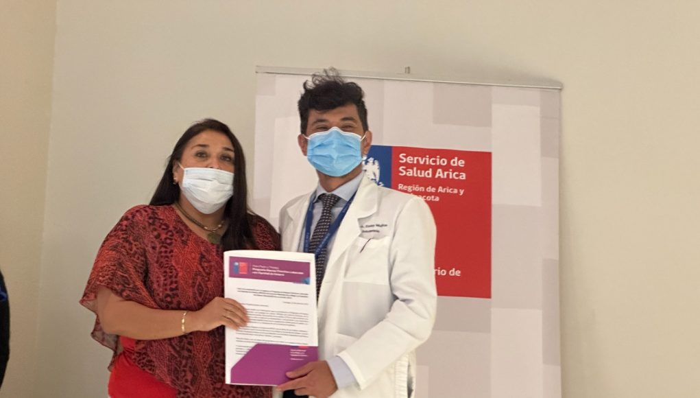 La directora regional del SernamEG, Lorena Ríos Echiburú, hizo entrega de la carta de aceptación formal al programa al director subrogante del Servicio de Salud Arica (SSA), Froilán Estay Mujica, en el marco del lanzamiento de la Campaña “Conectando miradas para el buen trato”, en el auditorio del Hospital Doctor Juan Noé Crevani.