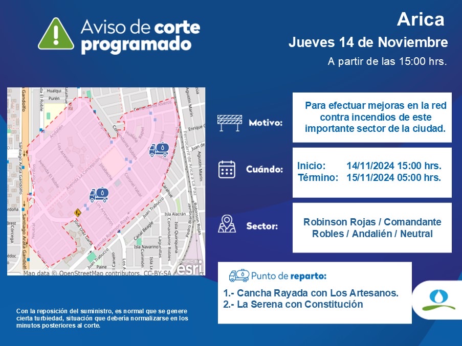 Agregó que para esta suspensión programada se dispondrá de dos puntos de distribución alternativos, los cuales estaránubicados en Robinson Rojas con Los Artesanos y en La Serena con Constitución. Cualquier duda o consulta, pude canalizarse a través del Call Center 600 600 9900 o a través de la página web www.aguasdelaltiplano.cl.