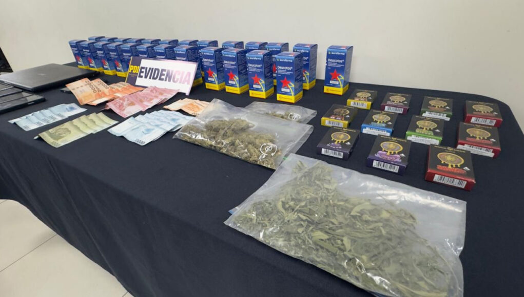 Además, se incautó cannabis sativa a granel, cartridges con vaporizadores que contenían resina de cannabis, comprimidos de éxtasis, y 25 frascos del mencionado jarabe con codeína.