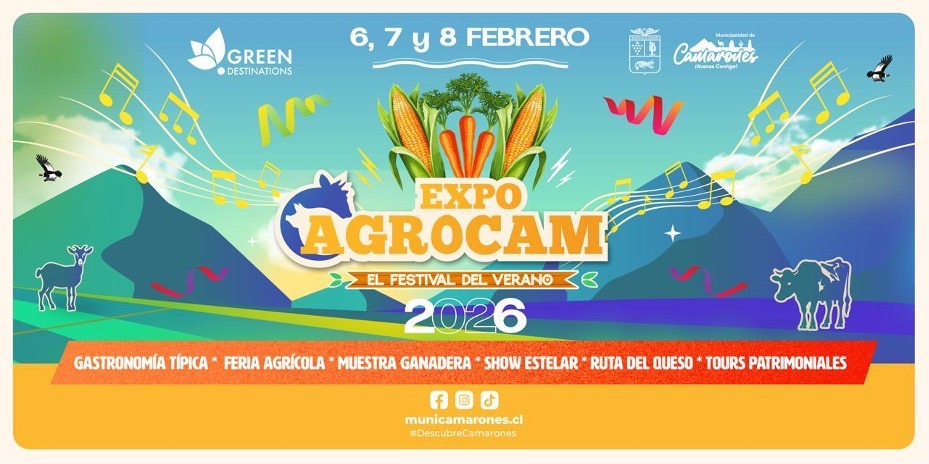 ¡Atentos a las redes sociales de la Municipalidad de Camarones! Muy pronto se darán a conocer todos los detalles de la programación y las sorpresas que EXPOAGROCAM 2026 tiene preparadas para este verano. No te pierdas la oportunidad de vivir el Festival del Verano en su máxima expresin: será una experiencia inolvidable para toda la familia!
